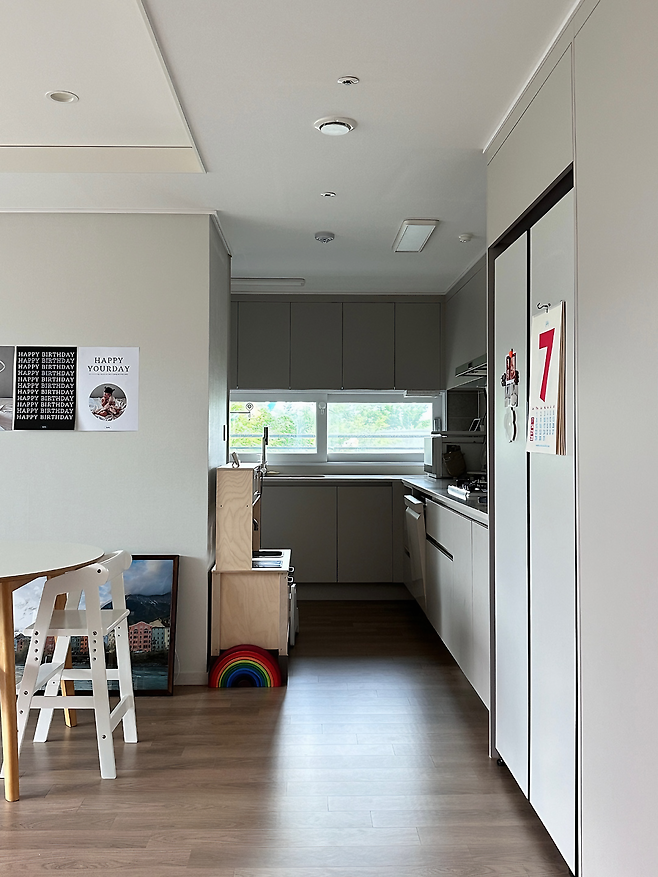 주방은 평수에 비해 넓지 않은 편이라 다른 가전은 수납장에 넣고 꺼내 쓰며, 최소한의 가전만 올려두고 있어요. 조리 공간이 지저분하면 온 집이 지저분한 느낌이라 매일 깔끔하게 유지하려고 한답니다. 또 하부장에는 아이가 열어도 안전한 물건들을 두고, 위험한 그릇이나 컵 등은 상부장에 두고 사용하고 있어요.