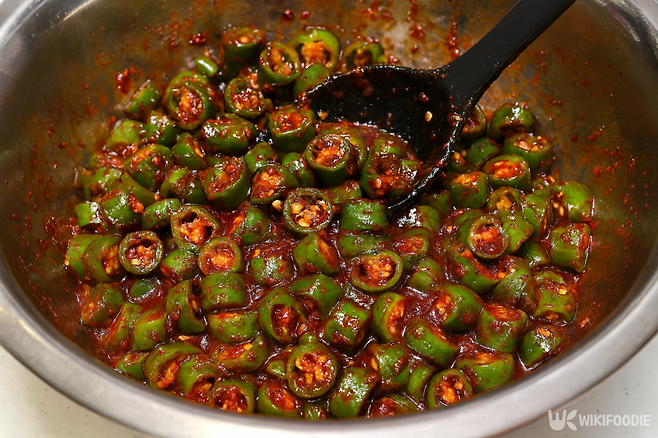 풋고추는 깨끗이 씻어 물기를 제거한 뒤 어슷하게 썬다. 너무 얇게 썰면 식감이 무너지고, 너무 두껍게 썰면 양념이 잘 배지 않는다. 0.5cm 정도 두께로 써는 게 적당하다. 준비한 양념장에 썰어둔 고추를 넣고 손으로 가볍게 버무린다. 이때 힘을 주면 풋고추가 부서지므로, 부드럽게 섞는다.