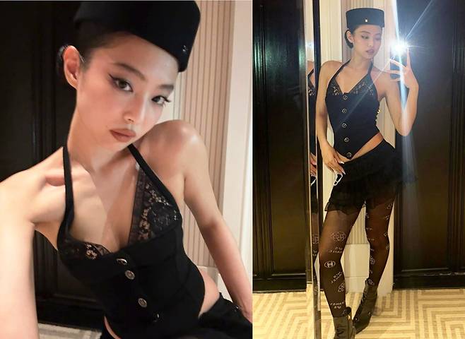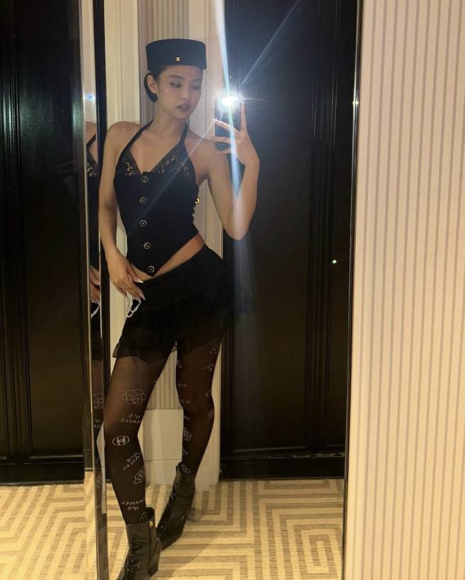 제니는 블랙 레이스 슬립탑과 시스루 프릴 미니스커트, 그리고 로고가 박힌 샤넬 시스루 타이츠를 매치해 섹시하면서도 클래식한 무드를 완성했습니다.