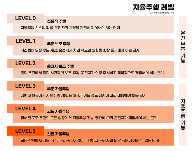 한화자산운용: 그렇습니다. 일단 자율주행 기술의 수준을 좀 나눠서 볼까요? 보통 미국 자동차공학회(SAE)에서 정의한 기준에 따라 레벨 0부터 5까지 구분하는데요.