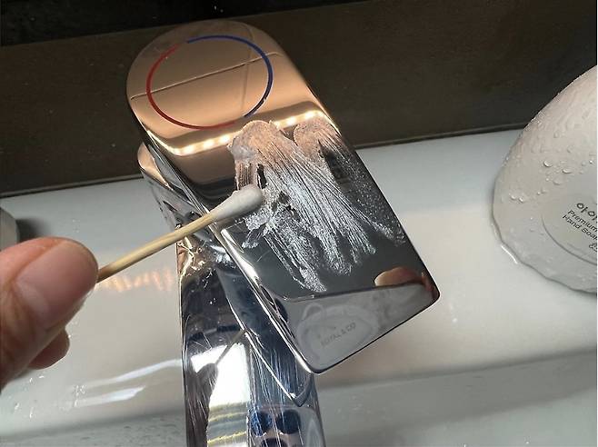 치약을 살짝 수전에 짜준 다음 솔로 슬슬 문질러준 다음 물로 여러 번 헹궈주세요