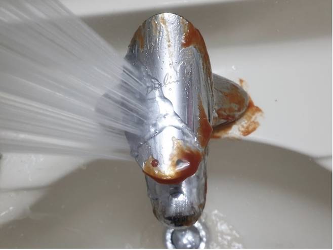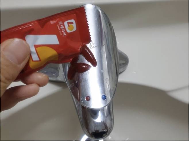 집에 돌아다니는 일회용 케첩이나 유통기한이 지나 먹기 찝찝한 케첩은 욕실 수전에 발라보세요~