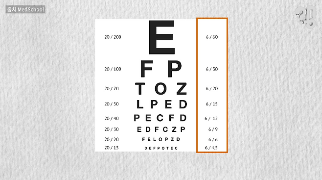 6/15는 남들은 15미터에서 보이는걸 5미터에서야 보인다는 것으로 시력이 나쁘다는 걸 의미한다.