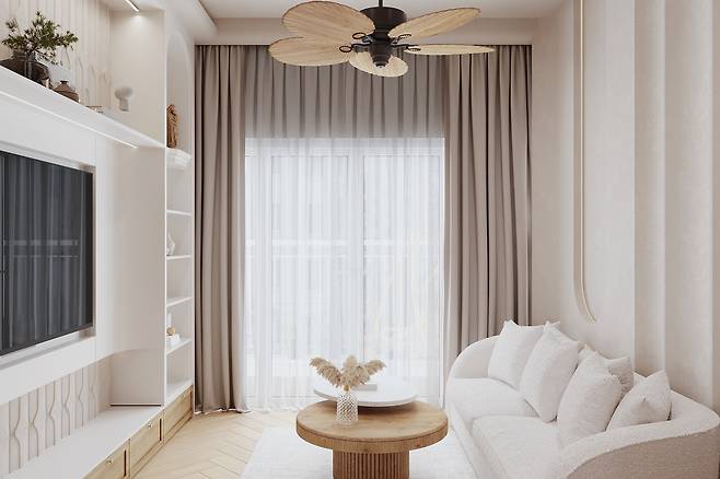 또한 벽면 색상과 커튼 컬러를 유사한 톤으로 맞추면 경계감이 줄어들어 시각적인 확장 효과를 얻을 수 있습니다.