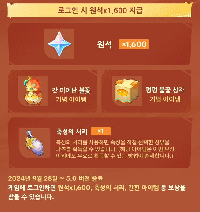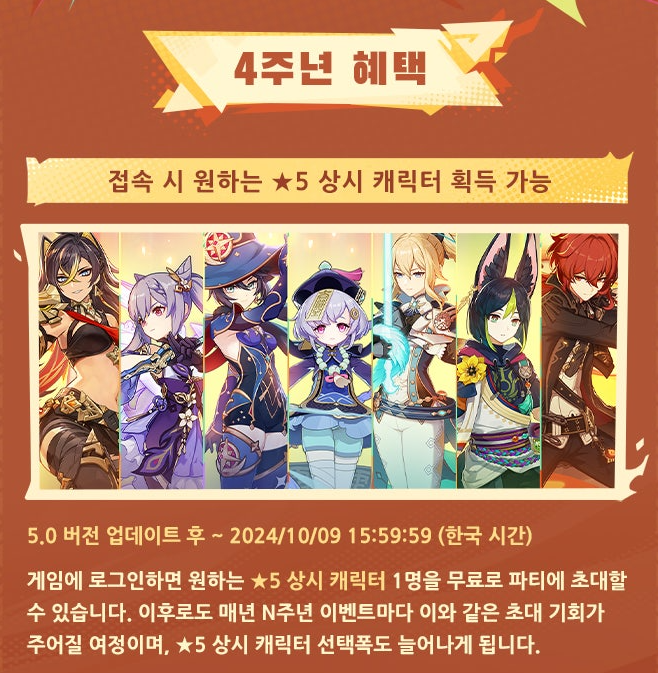 가장 눈길을 끄는 대목은 5성 캐릭터 지급이다. 호요버스는 5.0 업데이트 이후 10월9일 오후 3시59분 59초까지 게임에 로그인하는 모든 이용자들에게 5성 상시 캐릭터 1명을 무료로 파티에 초대할 기회를 제공한다. 무작위로 5성 캐릭터 뽑기권을 지급하는 것이 아니라 이용자들이 원하는 캐릭터를 선택하는 형태여서 더욱 의미가 크다.