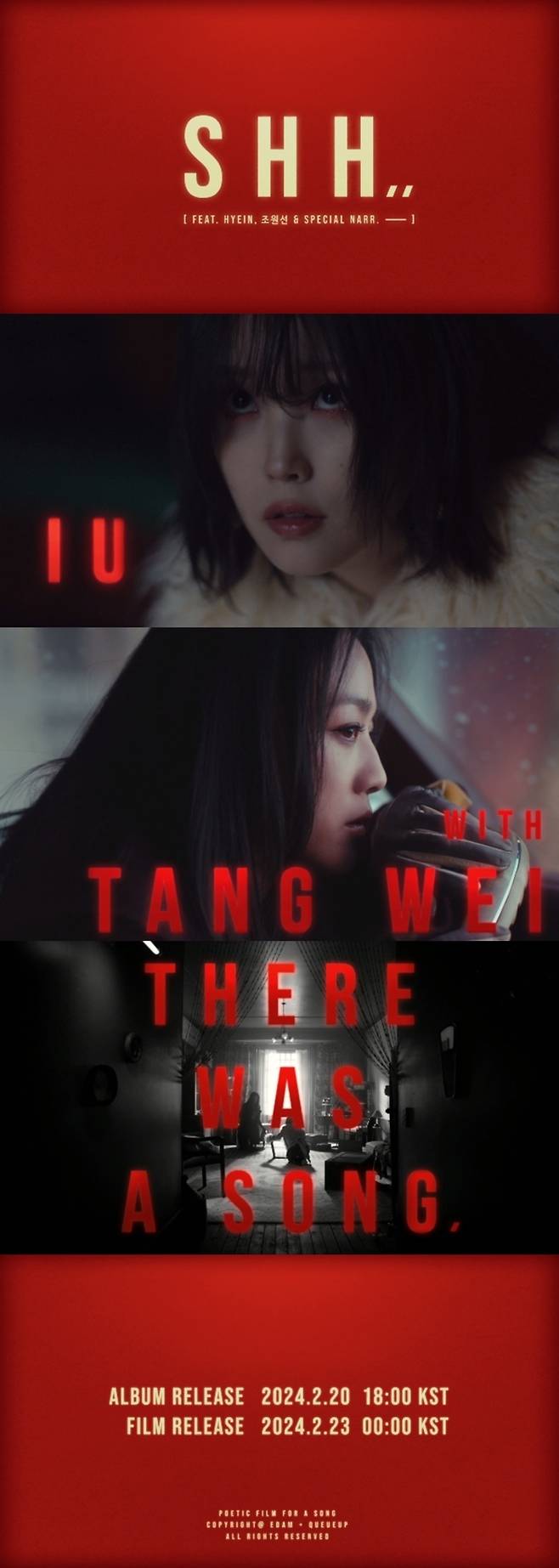 공개된 티저는 붉은 배경에 '쉬'(SHH)라는 글자가 띄워지는 것으로 시작한다. 흑발의 단발머리를 한 아이유가 어딘가를 올려다본다. 이어 자동차 핸들에 얼굴을 기댄 채 차창 밖을 지긋이 바라보는 탕웨이의 얼굴이 등장한다.