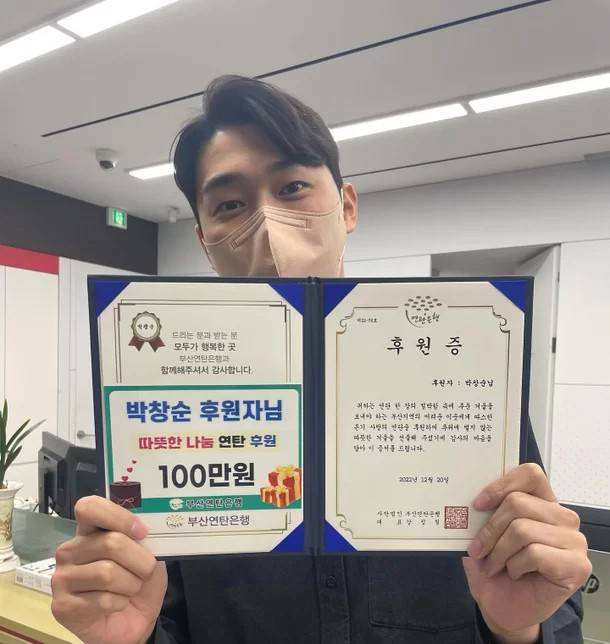 아울러 영철은 "그런 의미에서 출연료 전액 한턱내고 떠납니다"라며 부산연탄은행에 100만 원을 기부한 후원 증서를 들고 있는 사진을 함께 공개했다.