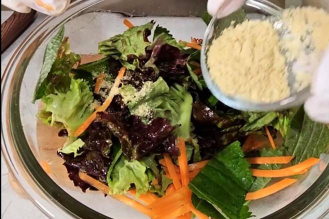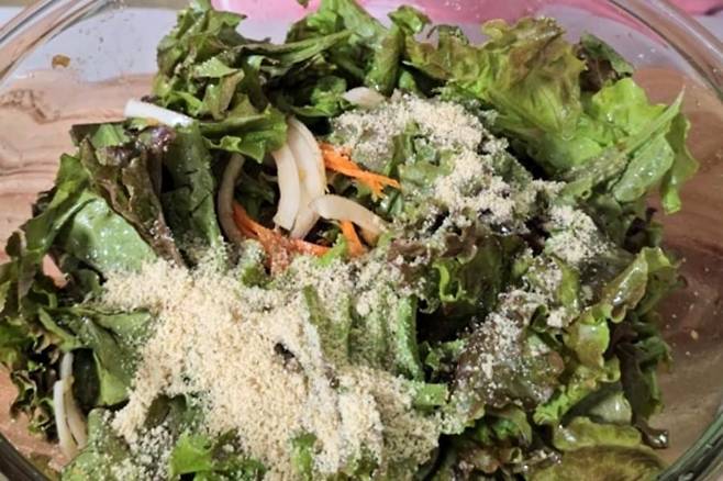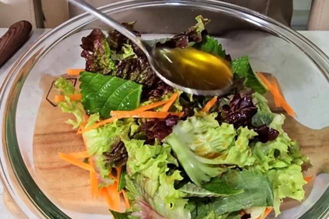 🌿 2. 씻은 나물은 물기를 최대한 제거합니다.👉 샐러드는 물기가 없을수록 소스가 잘 배어요.