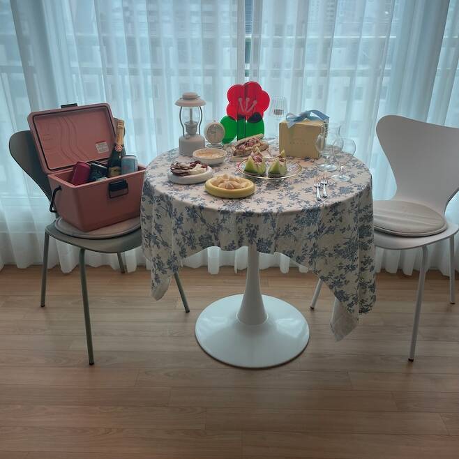 구축 24평 아파트에는 식탁 둘 공간이 애매해서 확장된 공간에 테이블과 의자를 두어 다이닝 공간으로 만들었어요. 확장된 공간을 아치로 만들어 공간이 분리된 느낌이라 좋은 거 같아요. 친구들이랑 음식도 만들어 먹고 소소한 파티를 즐겨요.