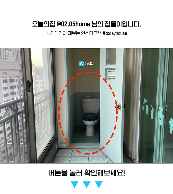 처음에 이야기한 없앤 화장실은 이곳입니다. 거실 베란다 쪽에 화장실이 있었어요. 여기에 화장실이 있는 게 저는 너무 놀랍고 신기했는데 예전 집은 많이 그렇다고 하더라고요. 이 공간을 잘 활용하면 아주 좋은 공간이 되겠구나 싶었어요.