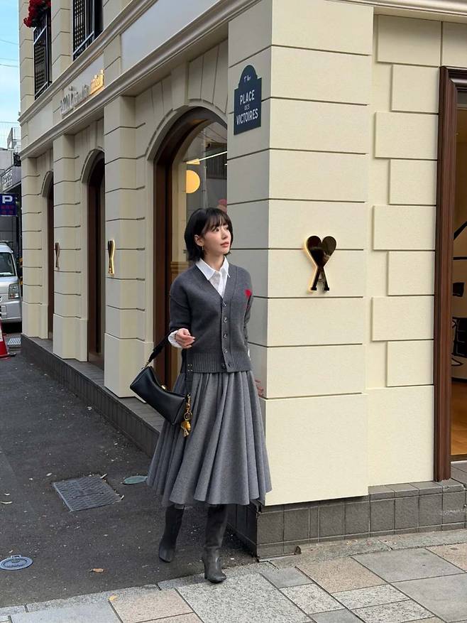 스커트 길이와 부츠의 조화도 눈에 띈다. 사쿠라는 다크 그레이 롱부츠를 선택해 따뜻함과 함께 클래식한 느낌을 살렸다. 블랙 컬러의 스퀘어 숄더백은 실용성을 더하고 백에 달린 키링 장식이 포인트 역할을 한다.
