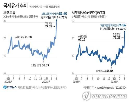 (서울=연합뉴스) 이재윤 기자 = 미국과 이란의 무력충돌 속에 이란이 호르무즈 해협을 사실상 봉쇄하면서 국제 유가가 3일(현지시간) 상승세를 이어갔다.