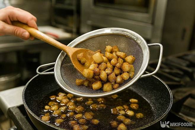 이후 팬에 붓고 약한 불로 천천히 끓인다. 기름과 찌꺼기가 분리되기 시작하면 면포나 고운 체에 걸러 순수 라드만 남긴다. 이 라드를 식혀서 얼음틀에 부어 냉동 보관하면 필요할 때마다 한 큐브씩 꺼내 쓰기 좋다. 김재중은 “소스에 넣으면 걸쭉하고 부드러워진다”며 “찌개, 볶음, 심지어 라면에도 넣는다”고 말했다.