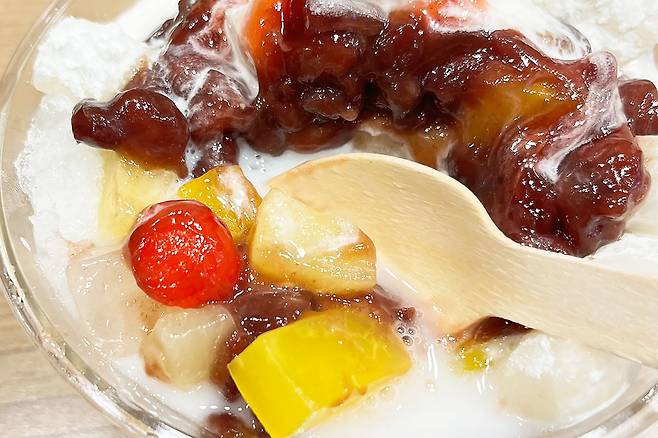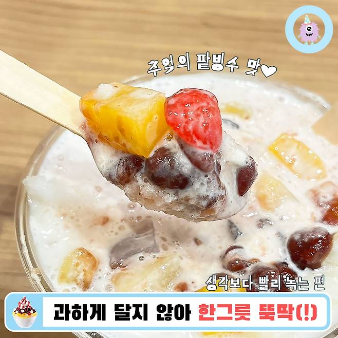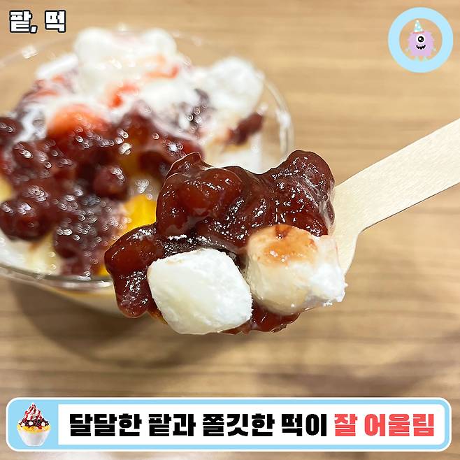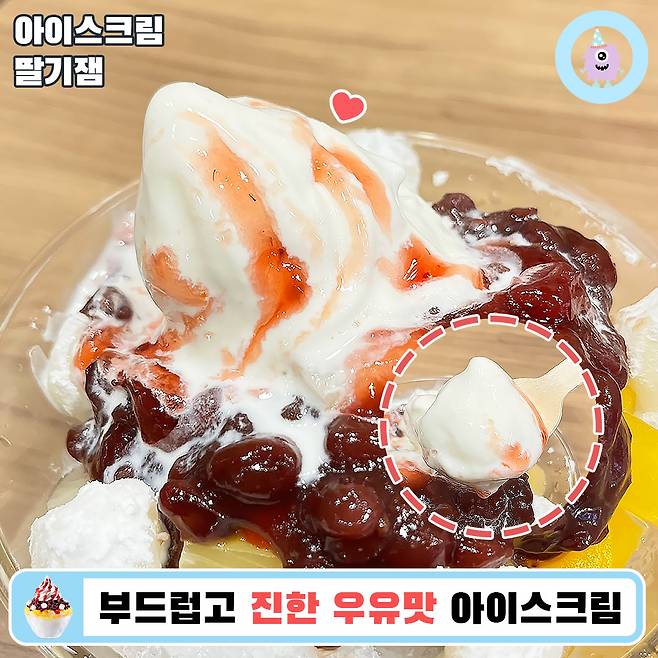 아이스크림과 딸기잼, 팥과 후르츠칵테일이 가득 들어있음에도 전체적으로 과하게 달지 않아서 시원함을 제대로 즐기며 한 그릇을 뚝딱 해치우게 되더라구요. 부족함 없이 씹히는 떡의 식감도 굿이었어요>_<