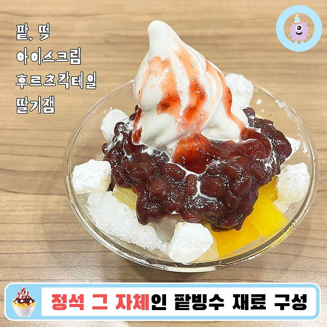 재료 구성을 보 팥빙수의 정석 그 자체였어요. 씹히는 맛이 있는 서걱서걱한 재질의 얼음에 후르츠칵테일, 부드러운 팥과 떡, 소프트 아이스크림과 딸기잼이 올라가 있었답니다. '옛날 빙수' 하면 떠오르는 이미지와 정확히 일치하지 않나요?