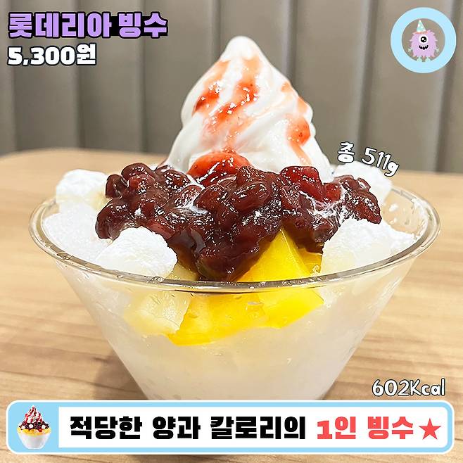 중량은 총 511g이고 1그릇 당 칼로리는 602Kcal라고 해요. 2인빙수가 대체로 800g 좌우인 것과 비교하면 결고 적지 않은 양인 것 같아요.