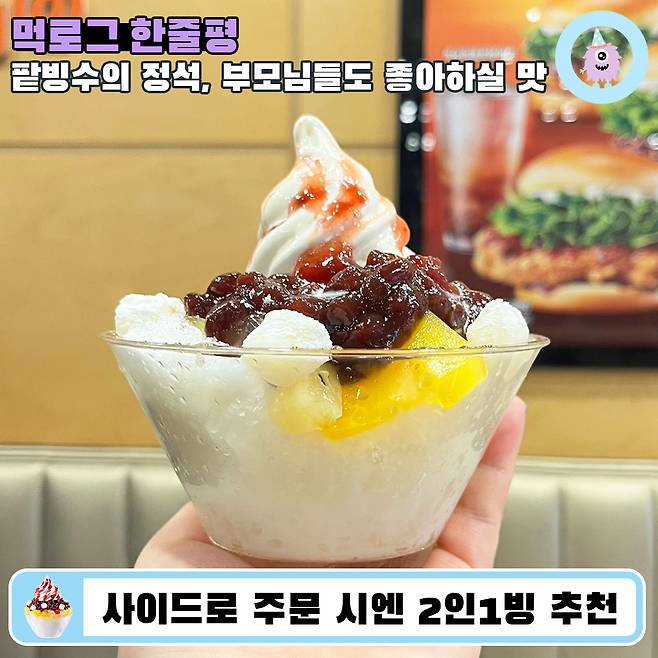 롯데리아에서 햄버거 메뉴와 함께 사이드로 빙수를 주문하신다면 2명이서 1그릇을 주문하시는 것을 추천 드려요.