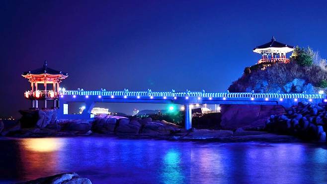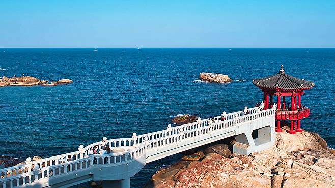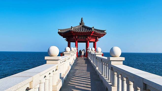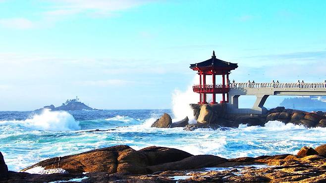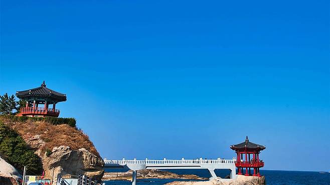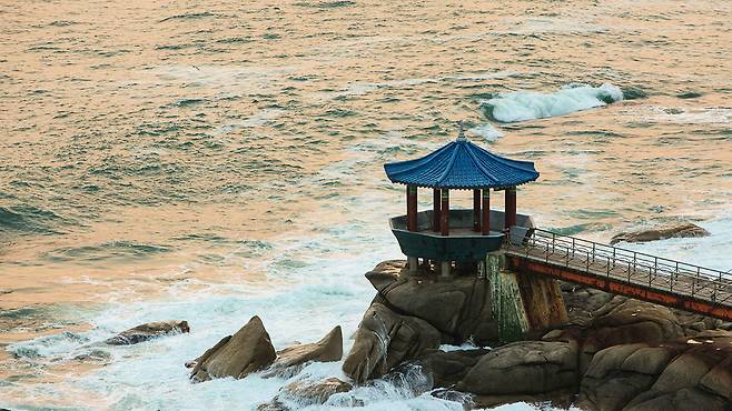 약 50m 길이의 다리를 건너 정자에 오르는 순간, 파도가 바위를 두드리는 소리는 마치 자연이 연주하는 음악처럼 들려온다.