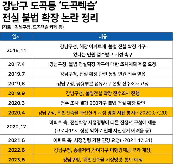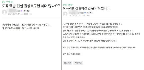 [땅집고] ”도곡렉슬만 전실 확장한 게 아닌데, 왜 강남구청만 복구하라는 건지. 1000가구가 다 복구하라는 게 말이 안 된다고 생각합니다. 강남구청이 인테리어업자들과 짠 것 같다는 생각이 들 정도에요.” (한 부동산 커뮤니티에 올라온 댓글)