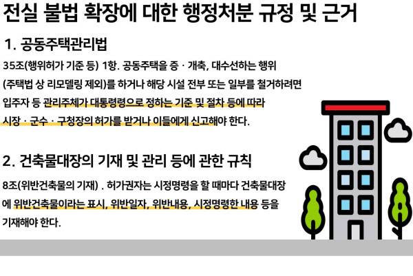 전실 확장은 편의성을 위한 것이나, 무단으로 할 경우 여러 법을 어긴 것으로 간주된다. 건축법과 공동주택관리법 등에서 개인이 공용공간을 함부로 손댈 수 없게 규정해서다.