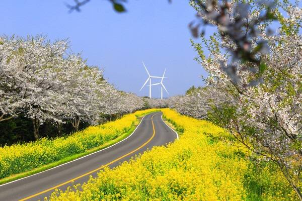 제주 녹산로 벚꽃길은 새파란 하늘과 분홍빛 벚꽃, 샛노란 유채꽃이 조화를 이루는 벚꽃 드라이브 코스입니다. CU표선 가시리점에서 시작해 유채꽃프라자를 거쳐 교래리 산13-10까지 약 10km에 걸쳐 펼쳐지는 도로 양옆으로 벚꽃과 유채꽃이 함께 피어 마치 꽃길을 달리는 듯한 기분을 선사하죠.