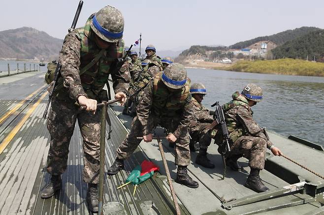 한국군이 보유 중인 리본부교세트는 교절수송차량 56대와 진입교절 12개, 내부교절 30개, 교량 가설 단정 14척으로 폭 100m 하천에 부교를 띠워 연결하는 데 1시가 30분의 시간이 소요됩니다.