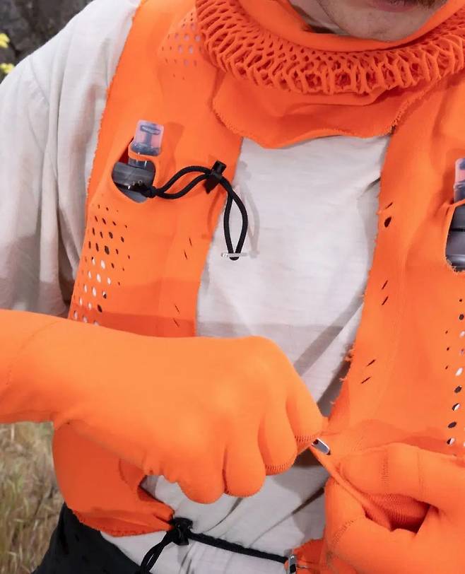 추천하고 싶은 제품은 워프 키트 베스트(Warp Kit Vest) GN‑P‑009. 이탈리아 최고 수준의 니팅 공장 치프라(Cifra)에서 제작한 워프 니트 원단을 사용해 몸에 착 감기는 핏과 탁월한 신축성을 자랑한다. 포켓은 흥미롭게도 봉제나 접착이 없는 짜임 구조라 전체 무게는 매우 가볍고 내구성은 놀라울 정도로 탄탄하다. 폴더블 워터 보틀 두 개가 안정적으로 수납되고, 에너지 젤이나 카드, 얇은 윈드브레이커 정도는 여유 있게 들어간다. 러닝은 물론 트레일, 등산, 자전거 라이딩 등 활동적인 순간 어디서든 안정적인 착용감을 제공한다. 구매는 여기.(https://tinyurl.com/3sf2jj5j)