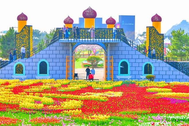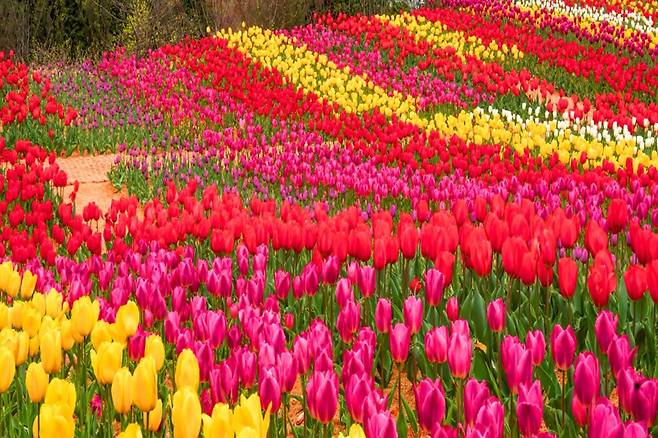 카루셀, 키코마치, 플라멩고 등 전 세계에서 온 300여 품종의 튤립이 대지를 가득 메우고 있는 장면은 그야말로 압도적입니다.