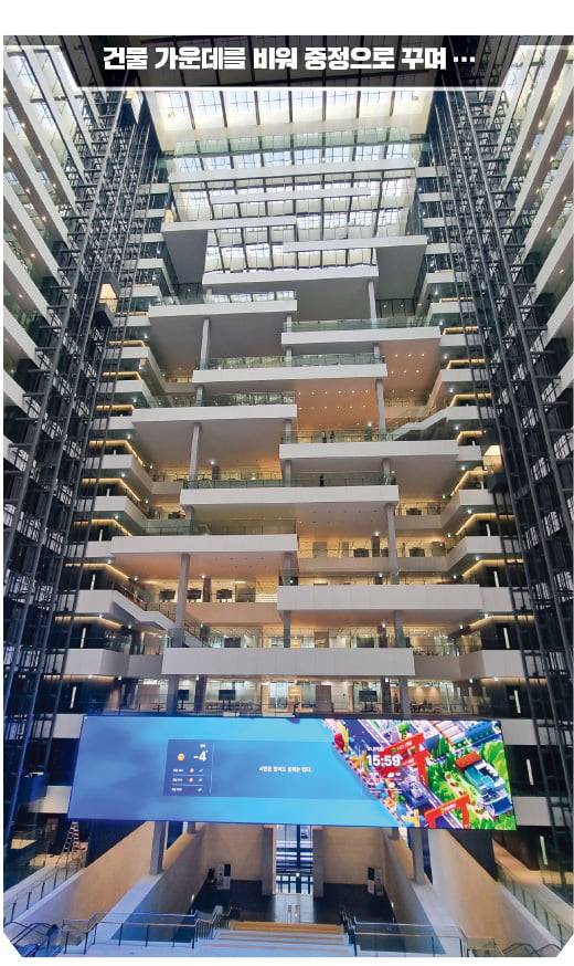 HD현대는 판교GRC 건물의 설계 의도를 ‘최상의 근무환경 제공’이라고 설명했다. 최첨단 스마트 오피스란 이름에 걸맞게 건물 내 무선네트워크(와이파이)는 어디에서든 끊기지 않고 쓸 수 있다. 카카오와 함께 구축한 앱을 통해 하루 85회 운행하는 통근버스부터 자율근무석, 개인사물함 예약 등이 가능하다. 총 722개에 달하는 회의실 예약과 사용 현황, 식당·화장실 혼잡도 등도 수시로 확인할 수 있다.