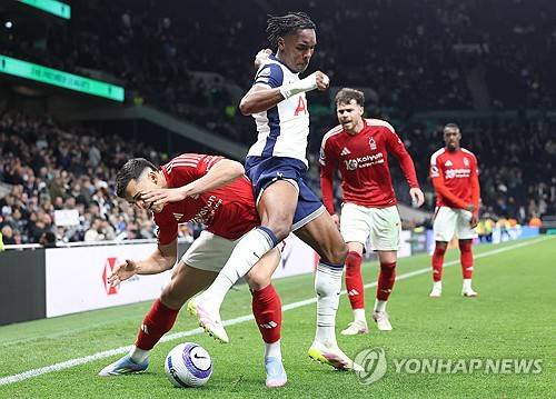 epa12045653 Ramon Sosa of Nottingham Forest (L) and Mathys Tel of Tottenham (R) in action during the English Premier League match between Tottenham Hotspur and Nottingham Forest in London, Great Britain, 21 April 2025. EPA/NEIL HALL EDITORIAL USE ONLY. No use with unauthorized audio, video, data, fixture lists, club/league logos, 'live' services or NFTs. Online in-match use limited to 120 images, no video emulation. No use in betting, games or single club/league/player publications.