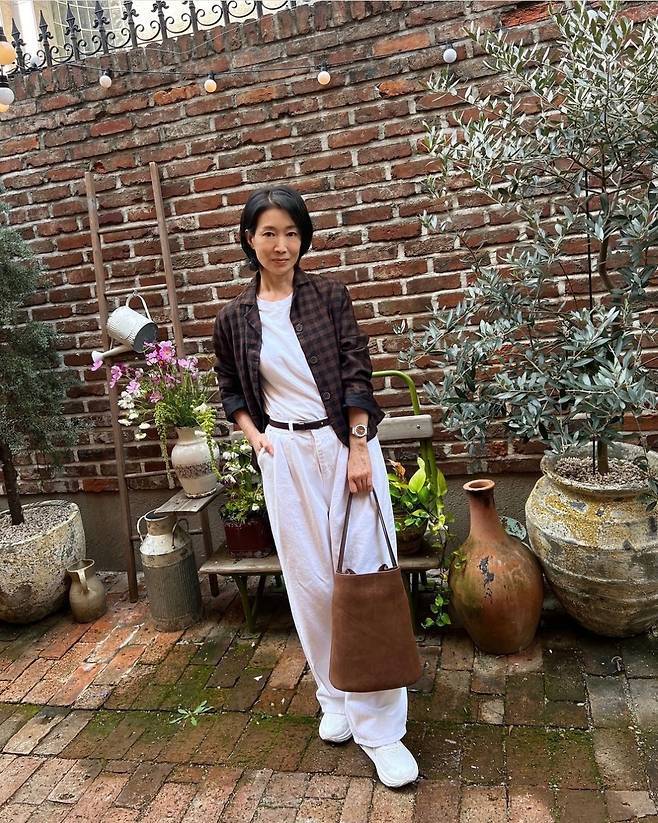 나영희는 체크 패턴의 재킷과 화이트 팬츠의 조합은 클래식하면서도 모던한 감각을 보였습니다.