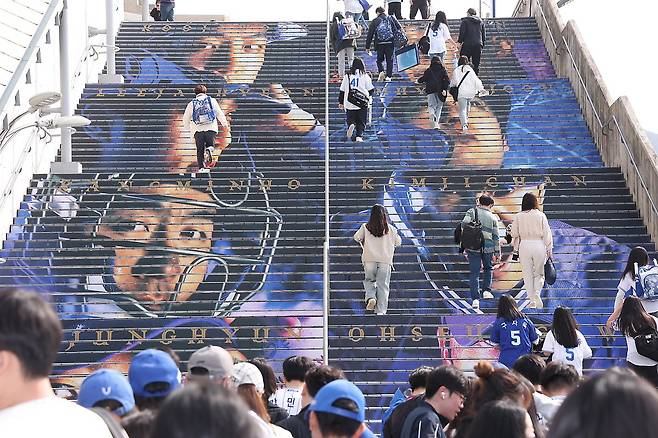 라이온즈파크의 외부를 찬찬히 돌아보다 보면 선수들의 코믹스 일러스트로 구장이 꾸며져 있는 모습을 볼 수 있다. 지난 2021년과 2022년, 스포츠 일러스트레이터 ‘광작가’와의 협업을 통해 계단과 주변 경관, 외야 잔디석이 선수들의 일러스트로 장식돼 있다. 지금은 타 팀으로 이적한 선수들부터 삼성의 레전드 선수들까지 있으니, 사람이 없는 조금 이른 시간에 도착한다면 최애 선수의 일러스트를 찾아 돌아다녀 보는 것도 라이온즈파크에서만 즐길 수 있는 하나의 묘미다. 또, 삼성 팬이라면 라팍의 명물 노란 폴대 뒤로 보이는 전설 이승엽의 벽화도 꼭 구경해보고 오는 것을 추천한다.