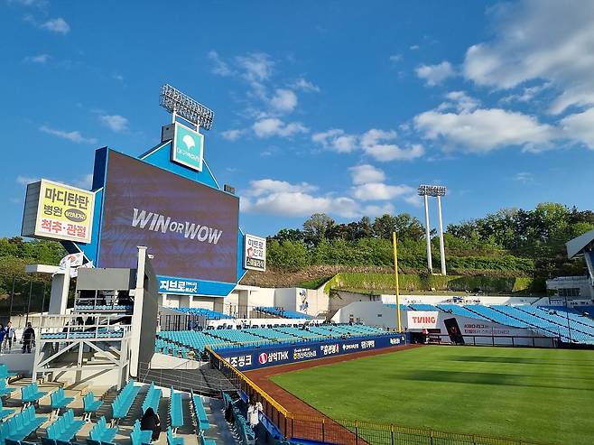 여느 야구장 관중석에서 그라운드를 바라보다 고개를 들면 조명탑 너머로 높은 빌딩과 아파트들이 즐비하다. 일과 후 여가를 즐기러 오는 사람들에겐 구장의 접근성 역시 중요하기에, 야구장은 주로 도심이나 살짝 치우친 중심부에 있는 경우가 대부분이다. 하지만 유일하게 회색빛 콘크리트 건물 대신 푸르른 녹음이 우리의 지친 눈을 맞아주는 곳이 있으니, 바로 대구에 위치한 삼성 라이온즈의 홈구장 ‘라이온즈파크’다. 맑은 초록빛 나무들과 특유의 깨끗한 파란색이 그라운드를 감싸 안고 누구보다 열정적인 야구장의 모든 이들을 품어주는 이곳, 라이온즈파크로 함께 떠나보자. (5월 31일 작성)