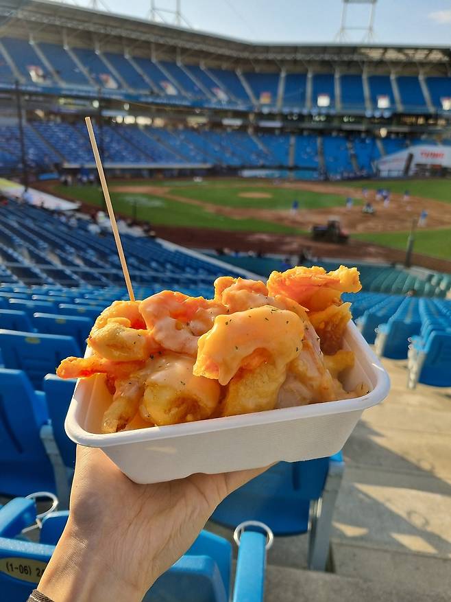 게다가 5층에는 인천 SSG 랜더스필드와 광주-기아 챔피언스필드에 입점해 선풍적인 인기를 얻은 크림 새우를 먹을 수 있는 ‘스테이션’이 입점해 있다. 가장 높은 곳에 있음에도 불구하고 1회가 시작하기 전에 완판되는 상황도 잦으니 크림 새우를 먹고 싶다면 야구장에 도착하자마자 가장 먼저 5층으로 달려가는 걸 추천한다. 만약 크림 새우를 사지 못했더라도 괜찮다. 대구에서 시작한 프랜차이즈 땅땅치킨을 여기에서도 맛볼 수 있으니! 1루 테이블석 뒤쪽 2, 3층과 1루 쪽 출입구 외부에 위치한 땅땅치킨의 허브 순살치킨은 적당히 바삭하고 촉촉한 맛이 오래도록 지속된다고 하니, 경기 시작 전 미리 포장해 자리에서 플레이볼을 기다려도 충분하다. 3층 옆쪽으로는 ‘5직 떡볶이’가 자리 잡고 있는데, 떡볶이도 물론 맛있지만 밀크쉐이크와 팥빙수가 숨겨진 맛있는 메뉴 중 하나다. 혹시나 열을 식힐 게 필요하다면 공수교대 시간에 빠른 걸음으로 나와 양손 가득 음식을 사 들고 가는 건 어떨까.