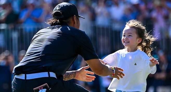 그린 위로 힘차게 달려오는 네 살 딸 벨라의 모습에 트로피를 내려놓은 앤서니 김은 순간적으로 무너지듯 눈물을 터뜨렸다. 벨라가 아빠의 다리에 매달리고, 아내 에밀리가 두 사람을 끌어안는 순간, 전 세계가 숨을 죽였다.