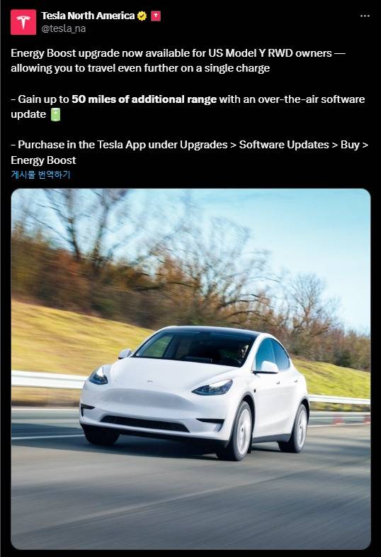 당시 테슬라 최고경영자 일론 머스크는 “단종된 모델 Y RWD를 위한 특별 주행 거리 확장 옵션이 제공될 것”이라고 언급하며 “추가적으로 1,500~2,000달러(약 200~270만원)를 지불하면 약 70~100km의 주행 거리를 더 확보할 수 있다”고 전했다.