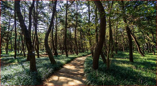 면적은 약 27만㎡, 산책로는 1.5km에 달하며 해안을 따라 걷는 코스가 조성되어 바다와 숲을 동시에 즐길 수 있습니다. 솔향 가득한 산책로 아래에는 맥문동과 해국, 송엽국 등이 자라 계절마다 다채로운 풍경을 선사하지요. 이곳은 2019년 산림청 국가산림문화자산으로 지정되었고, 2021년에는 자연휴양림으로도 등록되었습니다.