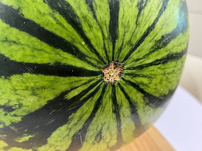 수박 고를 때, 수박을 뒤집어서 꼭지 반대편을 확인해 보세요. 배꼽이 작고 단단하게 닫혀있으면 합격입니다.
