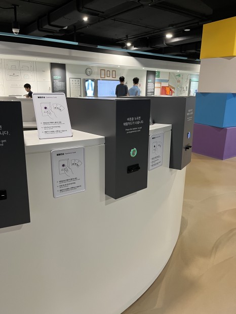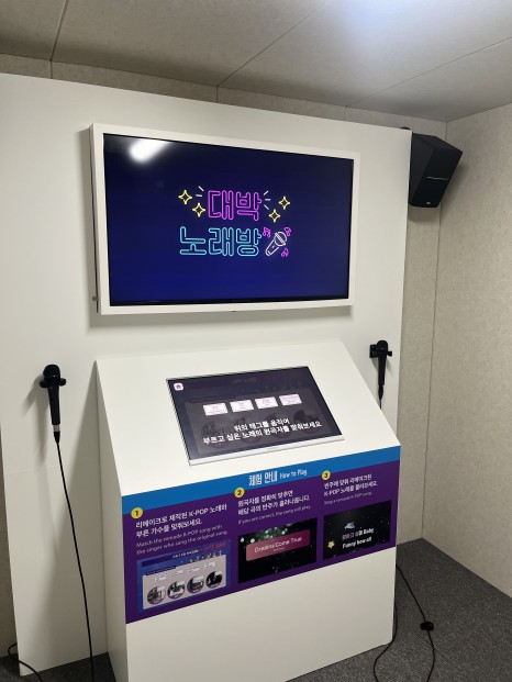 입구 바로 앞에는 노래방과 사진 부스가 있다. 전시관에서 노래방 체험이라니, 듣기만 해도 흥미로워 바로 들어갔다. 대중문화의 역사를 체험하는 전시관답게 옛날 노래를 재해석한 케이팝 노래를 골라 부를 수 있다. 원곡과 리메이크 노래를 조합하면 음악 반주가 시작된다. S.E.S의 노래를 재해석 한 에스파의 ‘드림스 컴 트루(Dreams come true)’, H.O.T의 노래를 재해석 한 엔시티의 ‘캔디’까지 다양한 노래를 불러볼 수 있다.