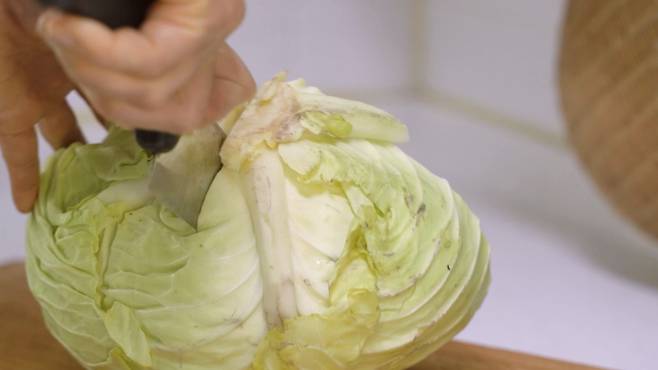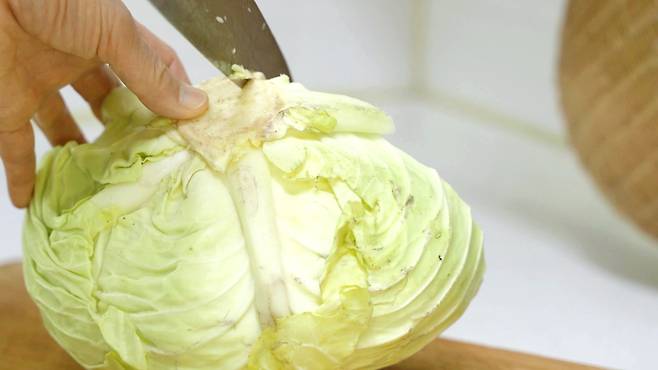 먼저 심지를 중심으로 양배추를 절반이나 4등분을 하여 자르세요.