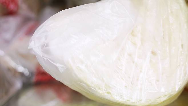 마무리로 위생비닐에 넣어 냉장고 신선칸에 넣으면 끝! 이렇게 보관하면 잘라 놓은 심지 부분으로 수분이 계속 공급되어 항상 신선한 양배추를 드실 수 있어 좋아요.