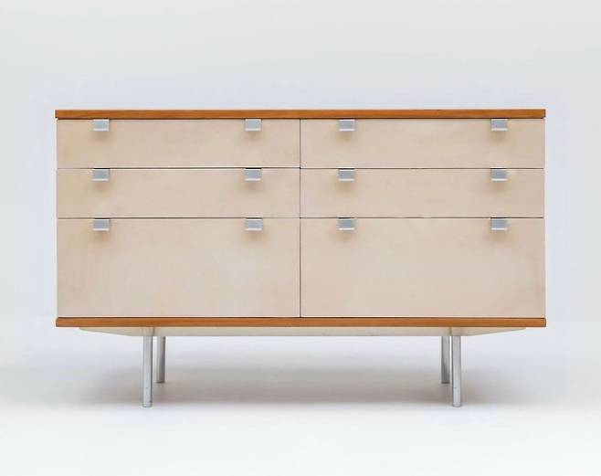 아일랜드 테이블의 영감이 된 것은 좋아하는 가구 디자이너의 빈티지 사이드 보드였어요. 위와 아래는 나무 테두리가 감싸는 형태지만, 각 서랍장 전체는 나무 테두리가 없는 형태였죠. 여기에 스테인리스 상판으로 마무리한다면 더 바랄 게 없을 것 같았어요.