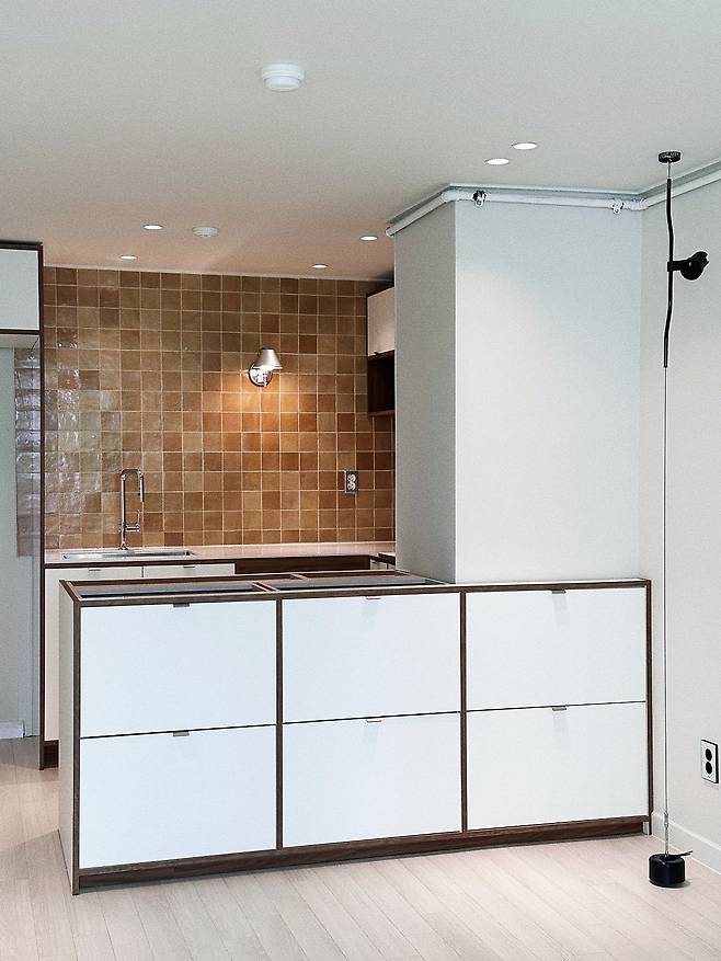 딱 이런 모습이요. 이 부분이 조화롭게 다가오지 못한다면, 아무리 개별 디테일이 살아 있다고 하더라도 늘 마음 한 편이 찝찝한 상태로 살 것 같았거든요. 그렇다면 언제나 한 면 전체를 마주하게 되는 아일랜드 테이블이 가장 예뻐야만 하는 것은 당연하겠죠? 저는 그렇게 아일랜드 테이블 냉장고장, 수도가 있는 싱크대 부분, 가려진 싱크대 부분의 순서대로 주방을 디자인했어요.