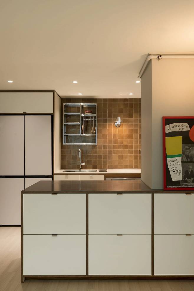 좁은 집일수록, 거실 한편에 소파를 두고 맞은편에 TV를 두고, TV나 소파의 우측에 주방을 둔 구조로 지내게 되잖아요. 하지만 저는 그런 전형적인 구조가 저희의 생활방식과는 맞지 않다고 생각했어요. '누워 잘 시간도 많이 없는데'하고 말이에요. TV가 집의 주인공이 아니라는 걸 알게 된 뒤로는 누가 이 집의 주인공이 되어야 할까 고민했어요. 그러다가 '주방'이 되어야 한다고 생각하게 되었죠.