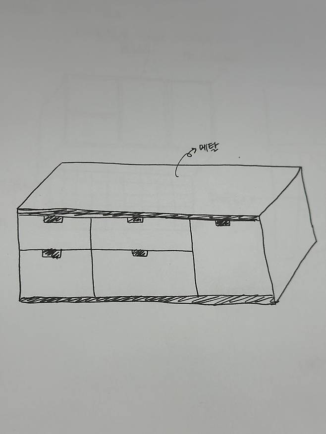 또 아일랜드 테이블의 손잡이 또한 이 사이드보드에서 영감을 받았는데요. 인테리어에 조예가 깊은 동료가 '판에 박힌 손잡이가 싫다면, 네가 좋아하는 것에서 손잡이를 가져와 봐'라고 말한 게 뇌리에 맴돌더라고요. 덕분에 제가 원하는 것을 정확하게 말하고, 디자이너 실장님의 구현으로 지금의 테이블이 완성되었어요. 그림은 대충 손으로 그려본 도면이랍니다.