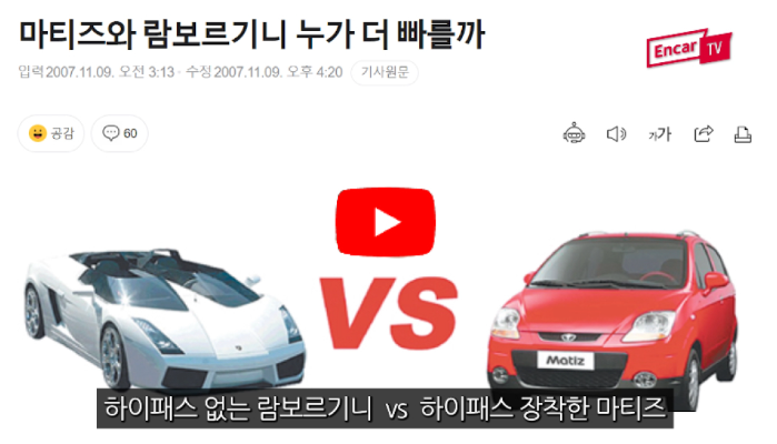 차급에 비해 기동력이 좋았던 마티즈는 한 가지 '무모한 도전'에 동원되기도 했습니다. 당시 하이패스 기술을 개발중이던 LG의 주선으로, 람보르기니와 '공도 레이스'를 벌이게 된 거죠. 룰은 간단했습니다. 구리에서 출발해 판교까지 도착하는 30km 구간을, 다른 일반 차량 통제 없이 람보르기니와 마티즈가 정면 승부를 벌였던거죠. 물론 한 가지 작은 차이는 존재했습니다. 람보르기니는 하이패스 없이 톨게이트 창구에서 멈춰서 요금을 내고, 마티즈는 하이패스를 사용하는 조건이었죠. 이 당시 80%가 넘는 네티즌들이 마티즈의 우승을 예상하며 뜨거운 응원을 보내줬었는데, 과연 그 결과는 어땠을까요?
