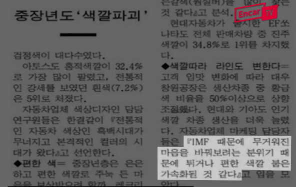 마티즈 자체가 뛰어난 상품성으로 말미암아 높은 판매량을 기록하는 가운데, '황금색' 컬러가 가장 많이 판매되었던 겁니다. 당시 마케팅 전문가들은 'IMF로 사회 분위기가 어두운 가운데, 화사한 컬러를 선호하는 경향이 있어 보인다'고 분석했습니다.