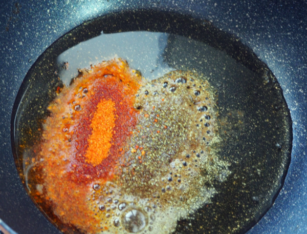 삼겹살을 볶은 팬에 그대로 다진 마늘과 아주 소량의 생강을 넣고 볶아준다. 생강은 삼겹살 특유의 잡내를 잡아주는 데 탁월한 효과가 있다. 마늘과 생강 향이 올라오면 고춧가루 2스푼을 넣고 불을 약하게 줄인 상태에서 천천히 볶아준다. 이 과정은 고춧가루가 타지 않도록 주의하면서, 기름에 충분히 향이 우러나도록 하는 게 중요하다.