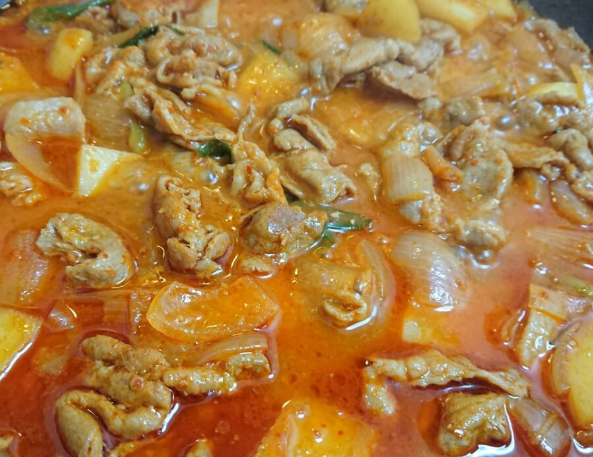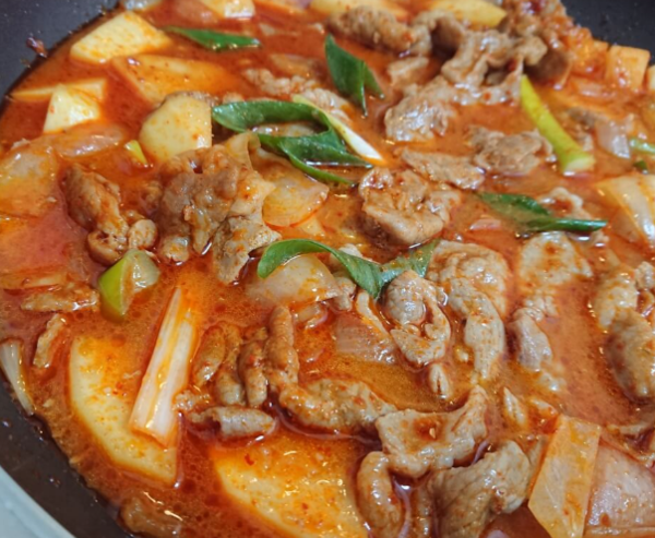 이 재료들을 팬에 넣고 기존에 볶아둔 향신재료와 함께 섞어준 다음 물 1리터를 붓는다. 물은 찬물보다 따뜻한 물을 사용하는 것이 양념이 빠르게 풀리고 재료들과 잘 섞이는 데 도움이 된다. 찌개가 끓기 시작하면 양념이 제대로 배어든 깊은 맛이 살아난다.