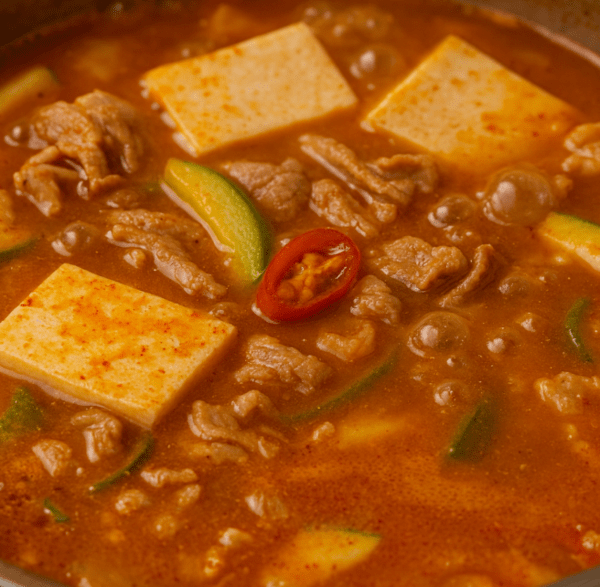 물이 팔팔 끓기 시작하면 얇게 채썬 양파와 반달 모양으로 썬 애호박을 넣어준다. 채소는 너무 일찍 넣으면 흐물거리고 식감이 사라지기 때문에 반드시 국물이 끓기 시작한 뒤에 투입해야 한다. 두부는 부서지기 쉬우므로 맨 마지막에 넣어 중불에서 자작하게 끓이는 게 좋다.